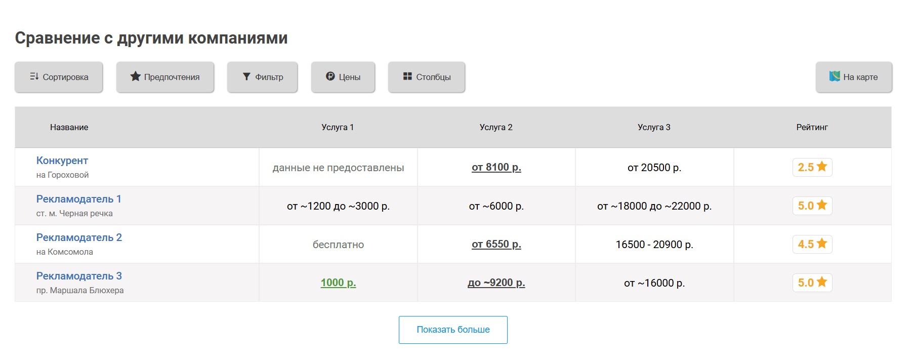 Вокруг продвигаемого таким образом турагентства выбирается некоторое количество ближайших конкурирующих турагентств, продвигаемое турагентство попадёт к ним в таблицу «Сравнение по ценам», которая выглядит следующим образом: